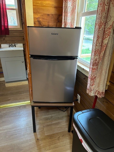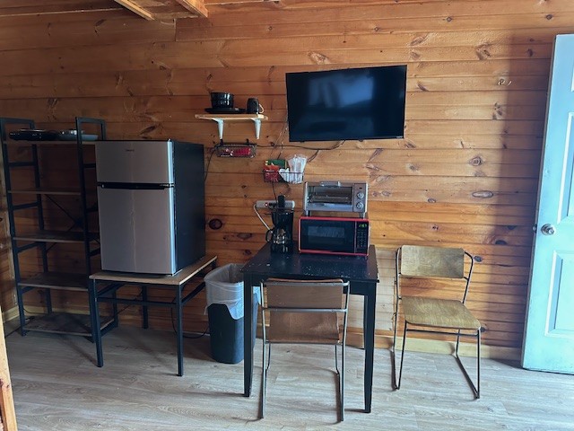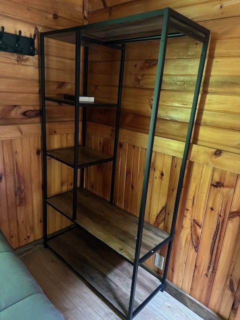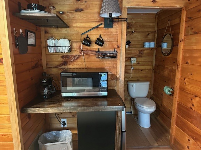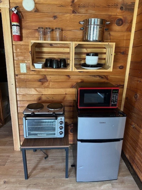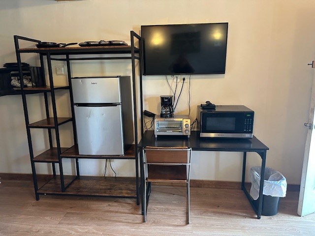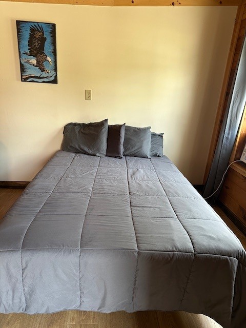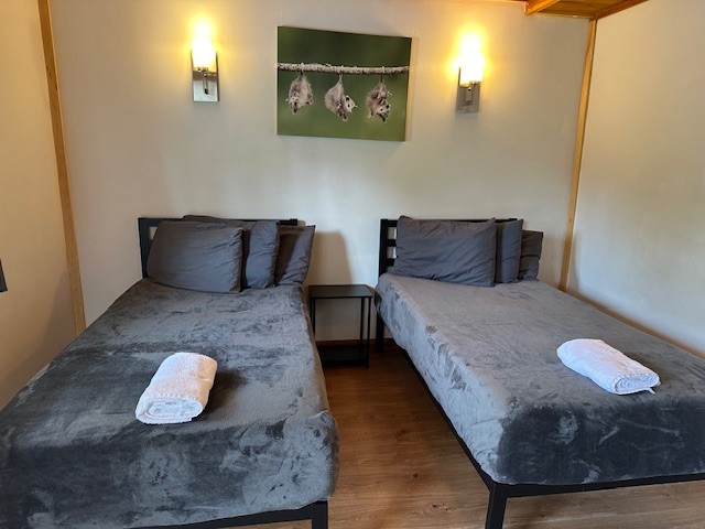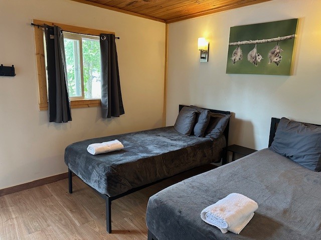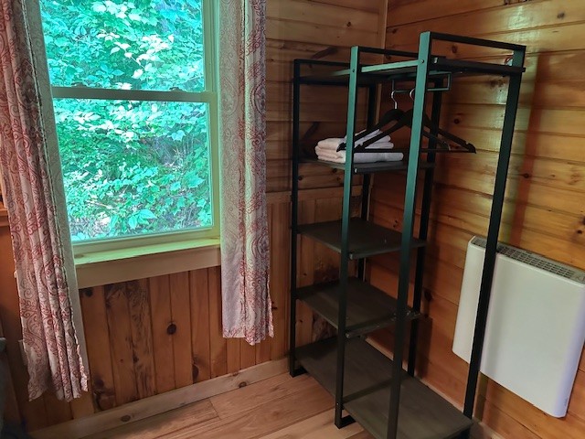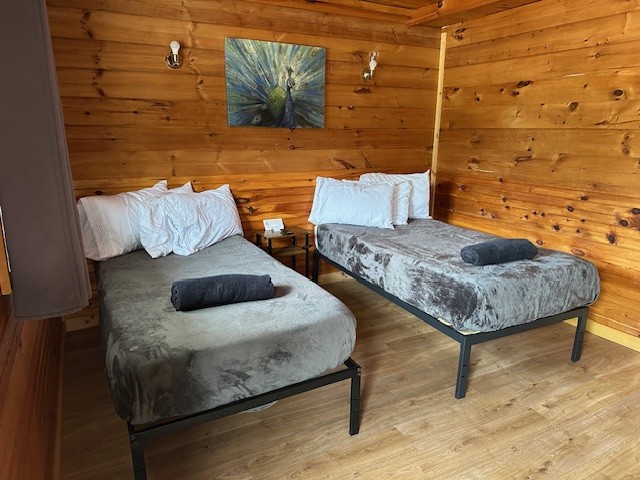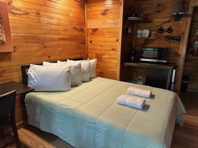 Raccoon Retreat is a quaint cabin with a view of the pool and the river. Perfect for couples or individuals traveling alone, it has a full bed, dishes, fold down table that can be used as a desk or a place to eat, coffee pot with complimentary coffee and a flat screen cable TV. Outside there is a picnic table, charcoal grill, and two Adirondack chairs on the porch to maximize your relaxation time. A hot plate, toaster, hair dryer, or clothes iron is available upon request. This room does not have space for an extra mattress or crib.